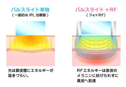 そこで、「光」+「熱」と言う、リスクなく安全に皮膚の奥まで到達させる「フォトRF」が開発されました。